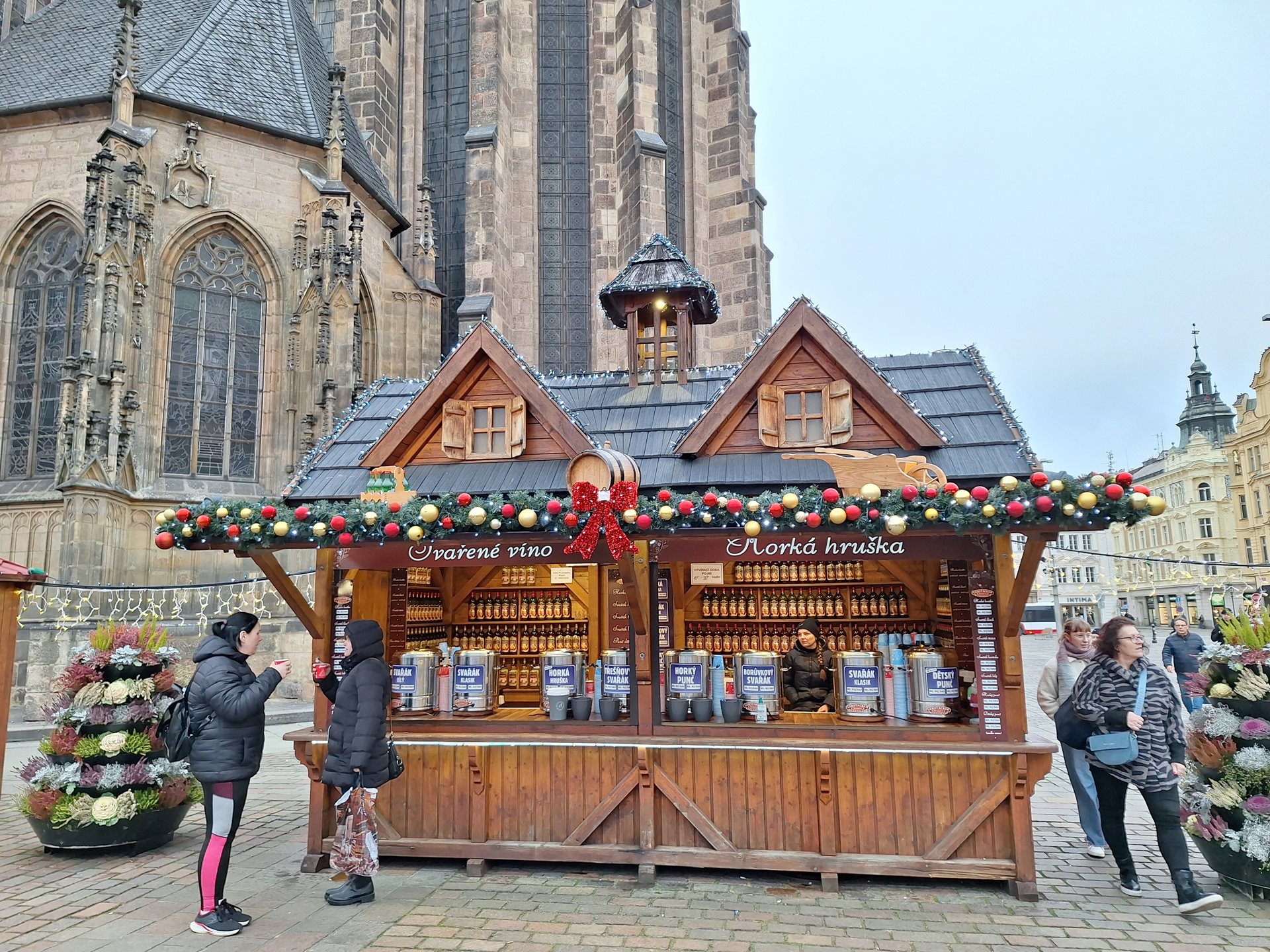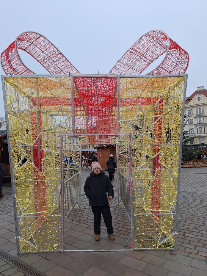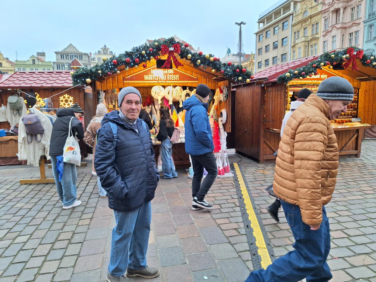 kolo. Po celém náměstí bylo nespočet krámků lákajících naše zraky – vánoční ozdoby a