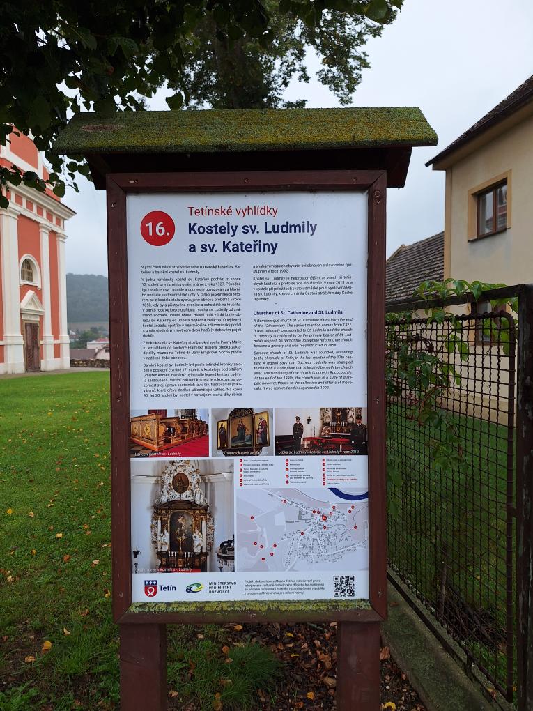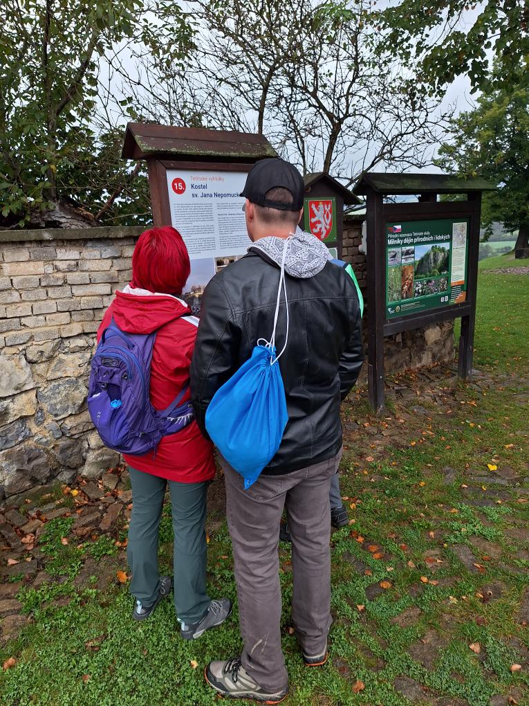 Tetínské muzeum bylo bohužel v tomto ročním období už zavřené, ale po celé obci jsou rozmístěny informativní tabule, kde jsme se dozvěděli vše o historii tohoto zajímavého místa. Dva kostely, mimochodem postavené nezvykle těsně vedle sebe, byly vidět už zdáli. Byl to kostel svaté Ludmily a druhý byl zasvěcen svaté Kateřině Alexandrijské. Odtud jsme pokračovali dál ke zřícenině tetínského hradu. Je odtud nádherný výhled na kraj okolo Berounky, která pod námi spěchala směrem k hlavnímu městu. Měli jsme štěstí i na vodáky, kteří kolemjdoucí zdravili svým známým pokřikem a my jim s radostí zamávali. Výhled je odtud úchvatný. Neméně nádherný pohled je i na tetínské vyhlídce poblíž kostela svatého Jana Nepomuckého.